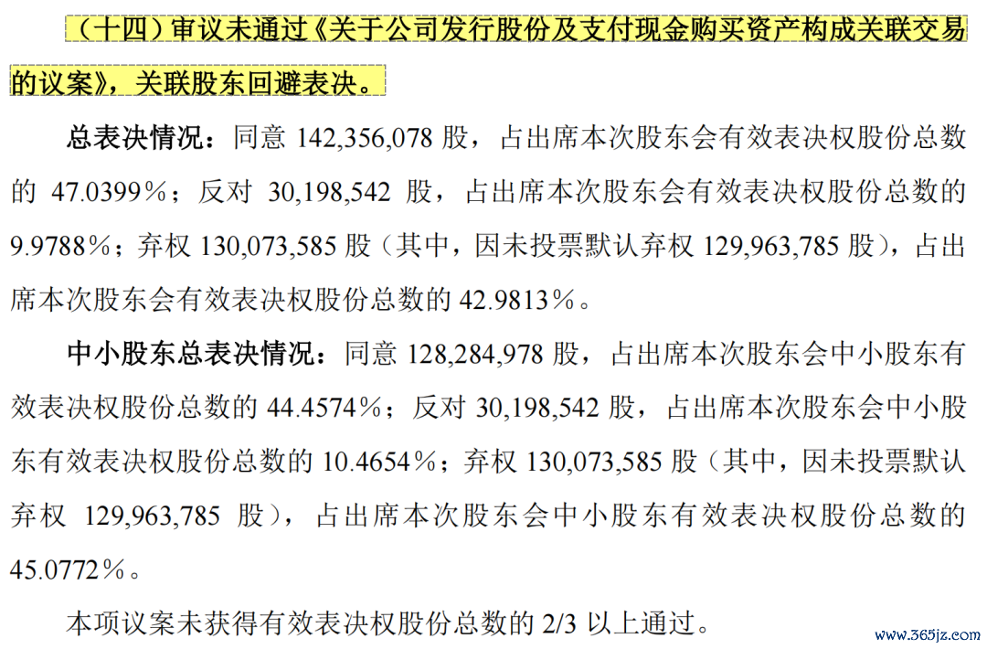 以《关于公司发行股份及支付现金购买资产构成关联交易的议案》为例,总表决情况为:同意1.42亿股,占出席本次股东会有效表决权股份总数的47.04%;反对3019.85万股,占出席本次股东会有效表决权股份总数的9.98%,其中反对票均由中小股东投出。