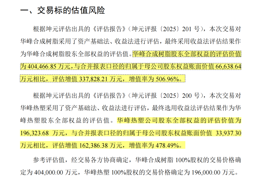 首先是收购标的的较高增值率引发质疑。根据公司发布的草案,华峰合成树脂股东全部权益的评估价值为40.45亿元,增值率为506.96%。华峰热塑公司股东全部权益的评估价值为19.63亿元,其增值率为478.49%。